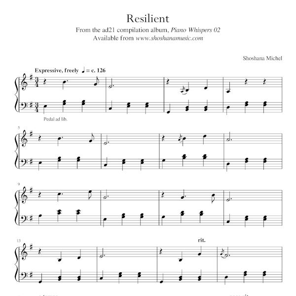 Note-for-note sheet music transcription of “Resilient” by Shoshana Michel from the ad21 compilation album, Piano Whispers 02.